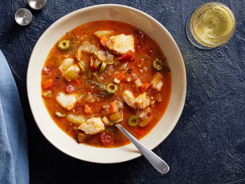 5. When you are ready to serve, return the mixture to a boil over medium heat, then add the olives and the fish. Once the mixture begins to bubble at the edges, reduce the heat to medium-low, cover and cook for about 5 minutes, or until the fish is opaque and flakes easily. Stir in the reserved orange juice and remove from the heat.