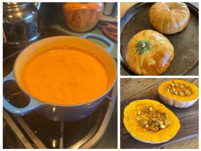 Winter squash and pumpkins are abundant and beautiful at the market now. I began making this soup in various versions many years ago based on a recipe in the New York Times. I can no longer find the recipe in my files or online, but a recipe with precise measurements isn’t necessary. You can wing it and make your own adaptations to the ingredients and methods I provide here.